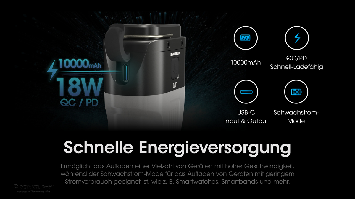 Der integrierte Akku mit einer Kapazität von 10000mAh kann als Powerbank genutzt werden, die maximale Ausgangsleistung beträgt 18W.L
