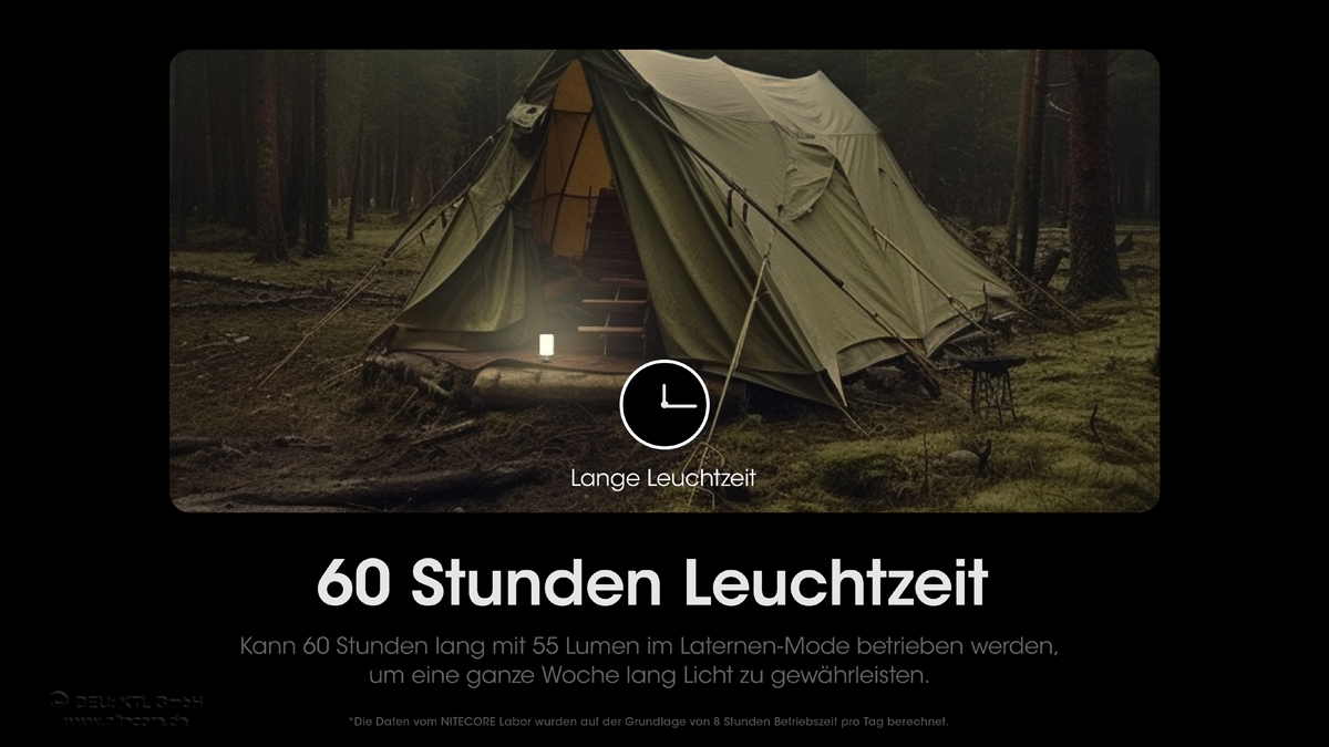 Leistung und Laufzeit High (100 Lumen) für ca. 5 Stunden Mid (40 Lumen) für ca. 10 Stunden Low (6 Lumen) für ca. 42 Stunden Candle Mode für ca. 5 Stunden