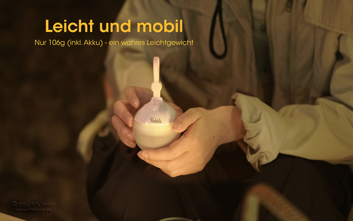 Nitecore BUBBLE, Laterne in 5 Farben" Mit der BUBBLE erscheint eine weitere Laterne im Sortiment von Nitecore, diesmal in einem futuristischem Design. Die kleine BUBBLE wird in 5 unterschiedlichen Farben angeboten. Betrieben wird die BUBBLE mit 3 Stück AAA-Micro NiMH Batterien, alternativ kann aber auch der Li-Ion Akku HLB1300 aus der Nitecore Stirnlampe UT27 verwendet werden.