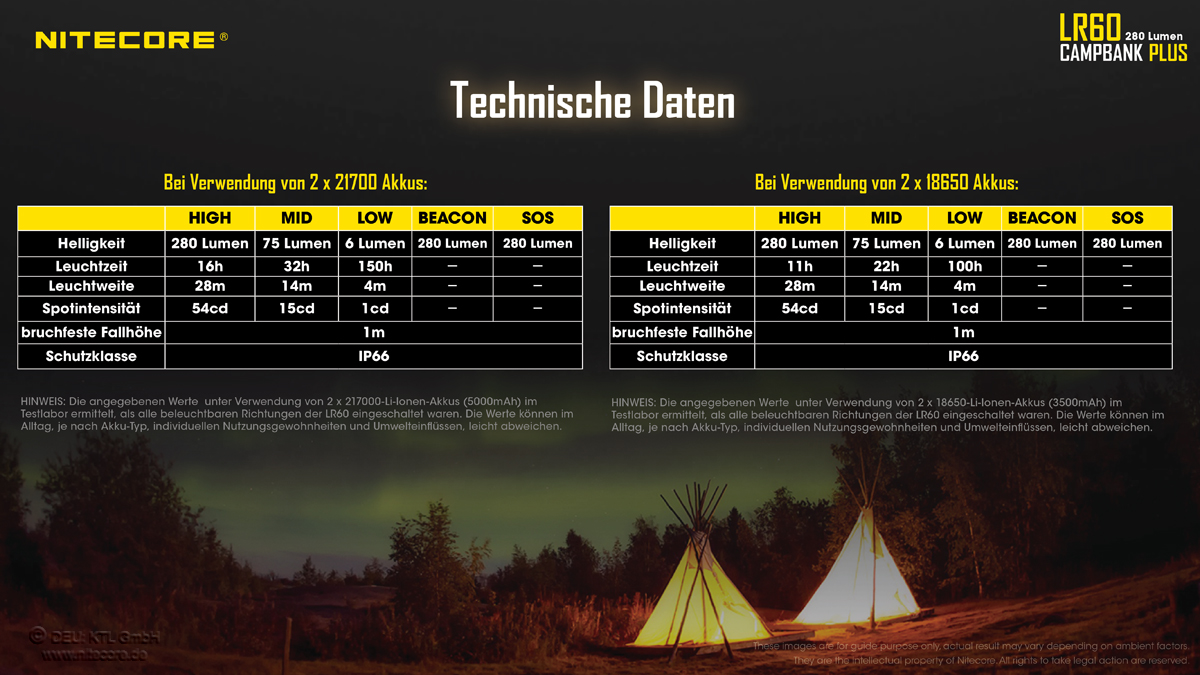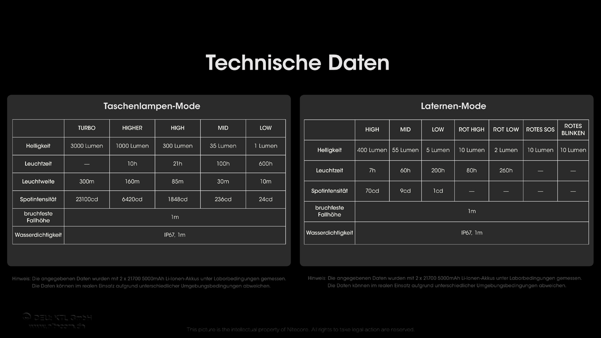 Die technischen Daten: bei der Nutzung vom 2.600mAh 18650 Akkus: Turbo: 650 Lumen 4:30 Stunden Hell: 350 Lumen 9:00 Stunden Mittel: 100 Lumen 38:00 Stunden Dunkel: 50 Lumen 70 Stunden Eco: 10 Lumen 300 Stunden Blitz: 100 Lumen 70 Stunden bei der Nutzung vom 3.500mAh 18650 Akkus: Turbo: 650 Lumen 6:00 Stunden Hell: 350 Lumen 12:00 Stunden Mittel: 100 Lumen 51:00 Stunden Dunkel: 50 Lumen 93 Stunden Eco: 10 Lumen 400 Stunden Blitz: 100 Lumen 93 Stunden