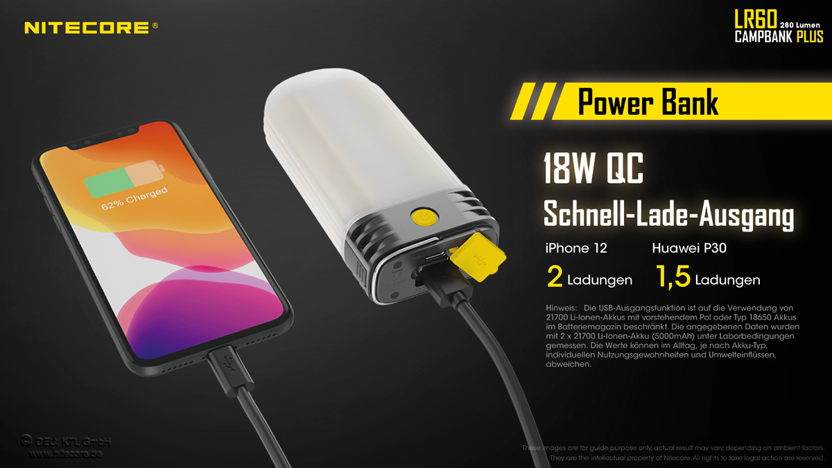 Die Akkus in der LR60 lassen sich über einen USB-C Anschluss laden und können anschließend z.B. als Powerbank für unterwegs genutzt werden. Die Nitecore LR60 kann auch als Ladegerät für viele Akkus des Typs 21700 und 18650 verwendet werden