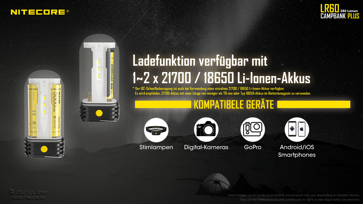 NITECORE LR60 - max.280 Lumen - mit Powerbank-Funktion für 21700 und 18650 Akkus