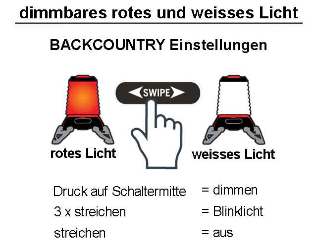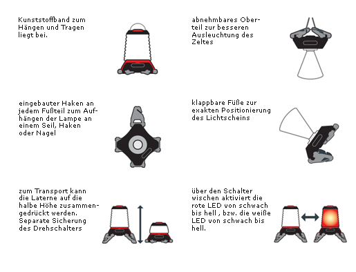 Sie bietet stufenlos dimmbares weißes (zwischen 150 Lumen und 30 Lumen) und dimmbares rotes LED Licht. Die Bedienung ist sehr einfach und erfolgt über eine schalterlose Kontaktfläche. Der faltbare Kunststoffaufsatz gewährleistet eine optimale Ausleuchtung der Umgebung und kann bei Bedarf auch abgenommen werden (Zeltbeleuchtung).