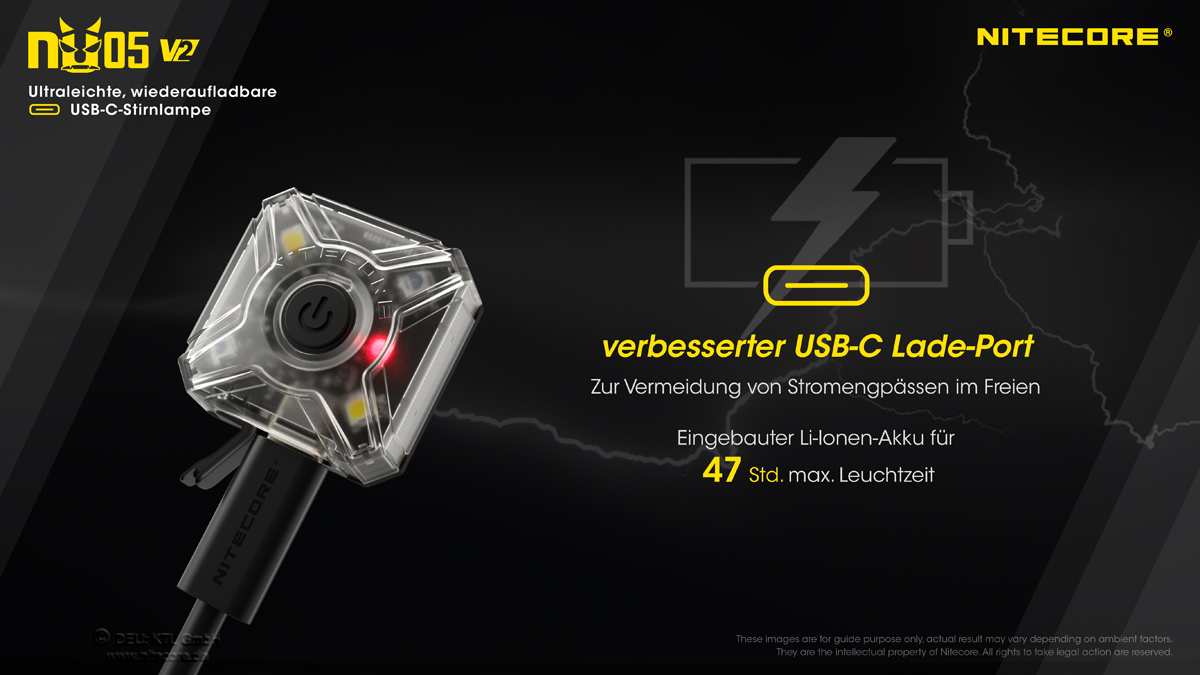 dessen eingebauter Li-Ion Akku über einen USB-C-Port aufladbar ist. Der auf der Rückseite angebrachte Clip lässt vielfältige Befestigungsmöglichkeiten zu, z.B. als „Rücklicht" einer Stirnlampe, Warnlicht an Ausrüstungsgegenständen. Die Nitecore NU05 V2 bietet rotes und weißes Blinklicht sowie weißes Dauerlicht.