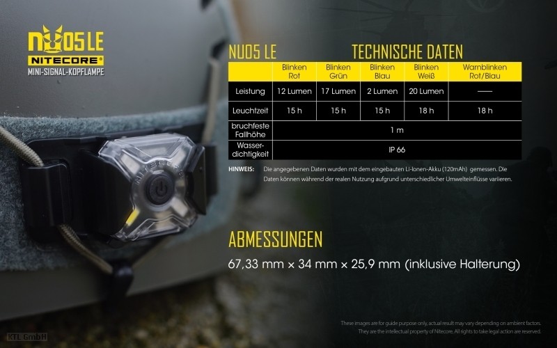kompatibel zu ARC-Schienen und MOLLE-Systemen. Die Nitecore NU07LE verfügt über 5 Hochleistungs-LEDs mit insgesamt 11 Leucht-Modi, die mit nur einem Taster gesteuert werden. Sie ist besonders leicht, robust und bruchfest.