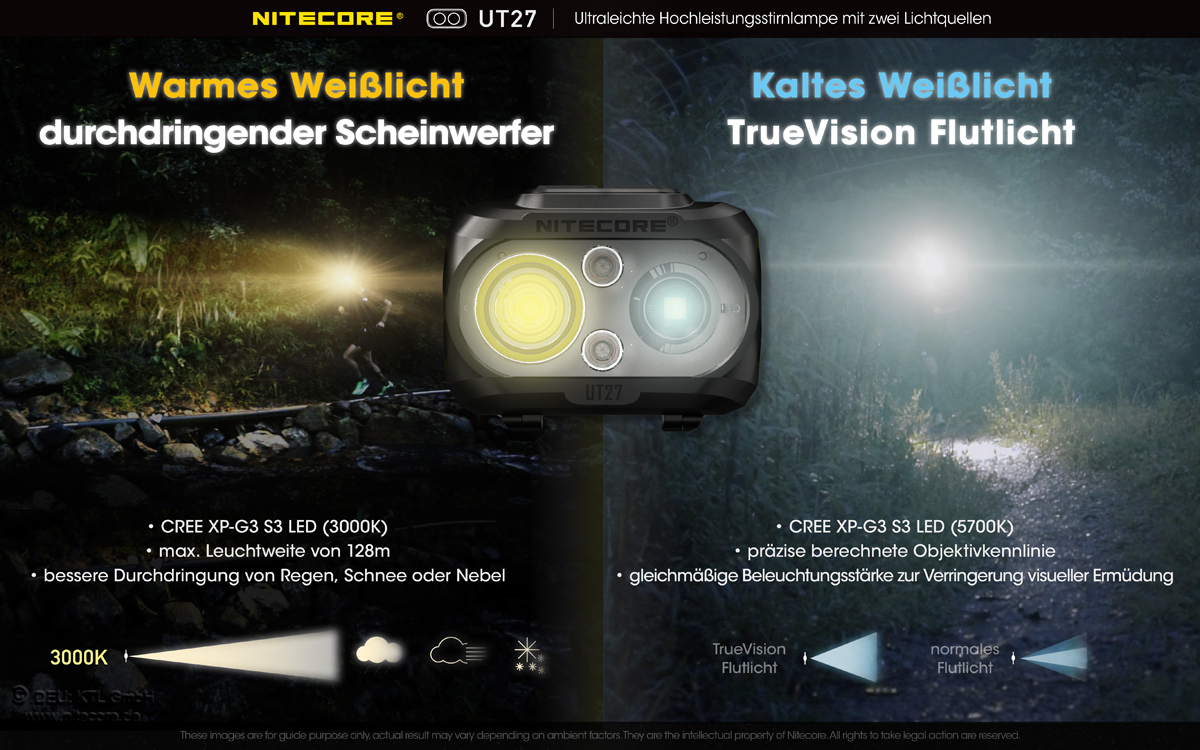 Die Nitecore UT27 ist eine leichte und leistungsstarke Stirnlampe. DIe UT27 wird mit dem mitgelieferten Li-Ion Akku (mit USB-C-Ladeanschluss) betrieben. Der Akku kann aber auch gegen 3 x AAA Micro-Batterien ausgetauscht werden. DIe Nitecore UT27 verfügt über mehrere Lichtquellen. Ein Spotlight (Cool White mit 3000K Lichtfarbe), eine Floodlight (Neutral White mit 5700K Lichtfarbe sowie Rotlicht.