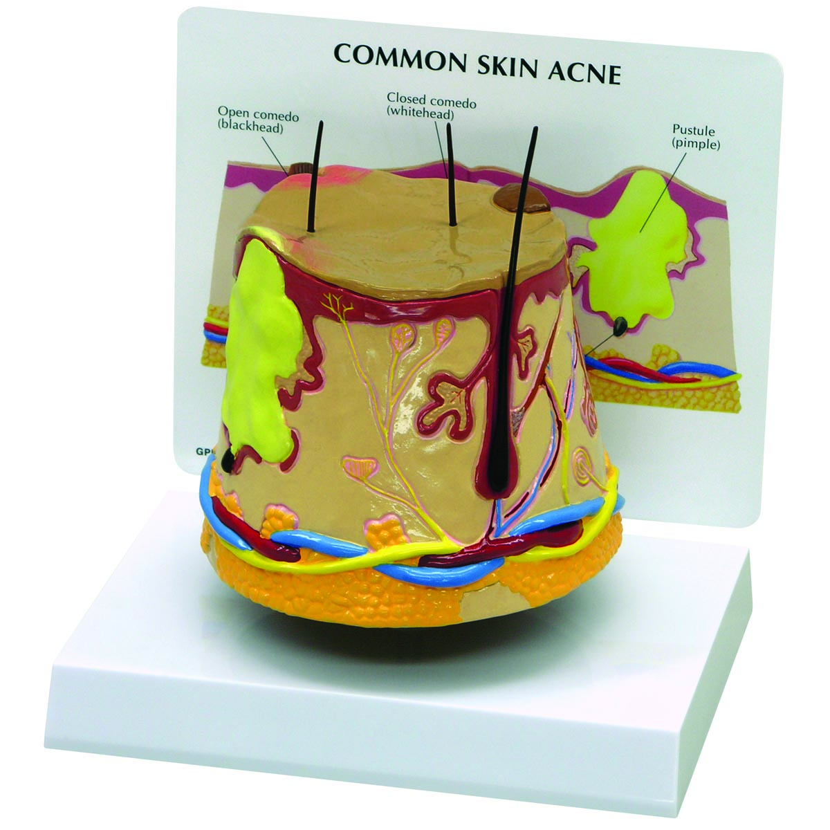 Vergrößertes zweiseitiges Hautquerschnittsmodell. Die „Akne"-Seite stellt drei Zustände dar: eine Weißkopfkrankheit, eine Schwarzkopfkrankheit und eine Pustel/Zyste. Die Rückseite veranschaulicht die normale Hautanatomie. Modellgröße: 15,2 x 5,7 x 10,2 cm