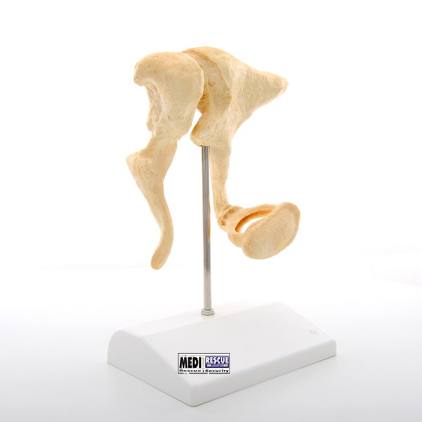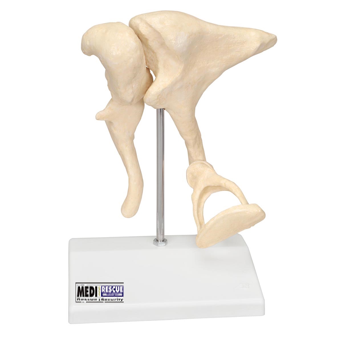 Als Gehörknöchelchen bezeichnet man die drei kleinsten Knochen des Menschen, die untereinander gelenkig verbunden sind und im Mittelohr liegen: Malleus (Hammer), Incus (Amboss) und Stapes (Steigbügel). Ihre Aufgabe ist die Weiterleitung des eintreffenden Schalls vom Trommelfell über das ovale Fenster zum Innenohr und die mechanische Schallverstärkung. Treten jedoch besonders laute Geräusche auf, gilt es, dass Innenohr vor nachhaltigen Schäden zu schützen. Dies gelingt über einen Reflex der Muskelaktivität auslöst (M. stapedius). Infolge wird der Steigbügel kurzfristig verkantet und die Schallleistung kann nur noch in Teilen übertragen werden. Vor zu starken Bewegungen der Gehörknöchelchenkette (z.B. beim Niesen und Husten) schützt ein weiterer Muskel (M. tensor tympani), er setzt am Hammer an und spannt das Trommelfell. Eine typische Erkrankung, die die Gehörknöchelchen betrifft und zu ihrer Versteifung mit zunehmender Schwerhörigkeit führt, ist die Otosklerose. Bei unserem Modell handelt es sich um die Abformung und Vergrößerung von knöchernen Originalen mittels Micro-CT. Gewicht 0.385 kg Größe17 x 12 x 21 cm