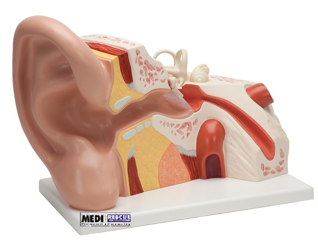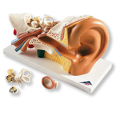 Dargestellt sind Außenohr, Mittelohr und Innenohr. Trommelfell mit Hammer und Amboss sowie Labyrinth mit Steigbügel, Schnecke, Hör- und Gleichgewichtsnerv sind abnehmbar. Mittel- und Innenohr sind durch zwei abnehmbare Knochenpartien verschließbar. Auf Sockel.