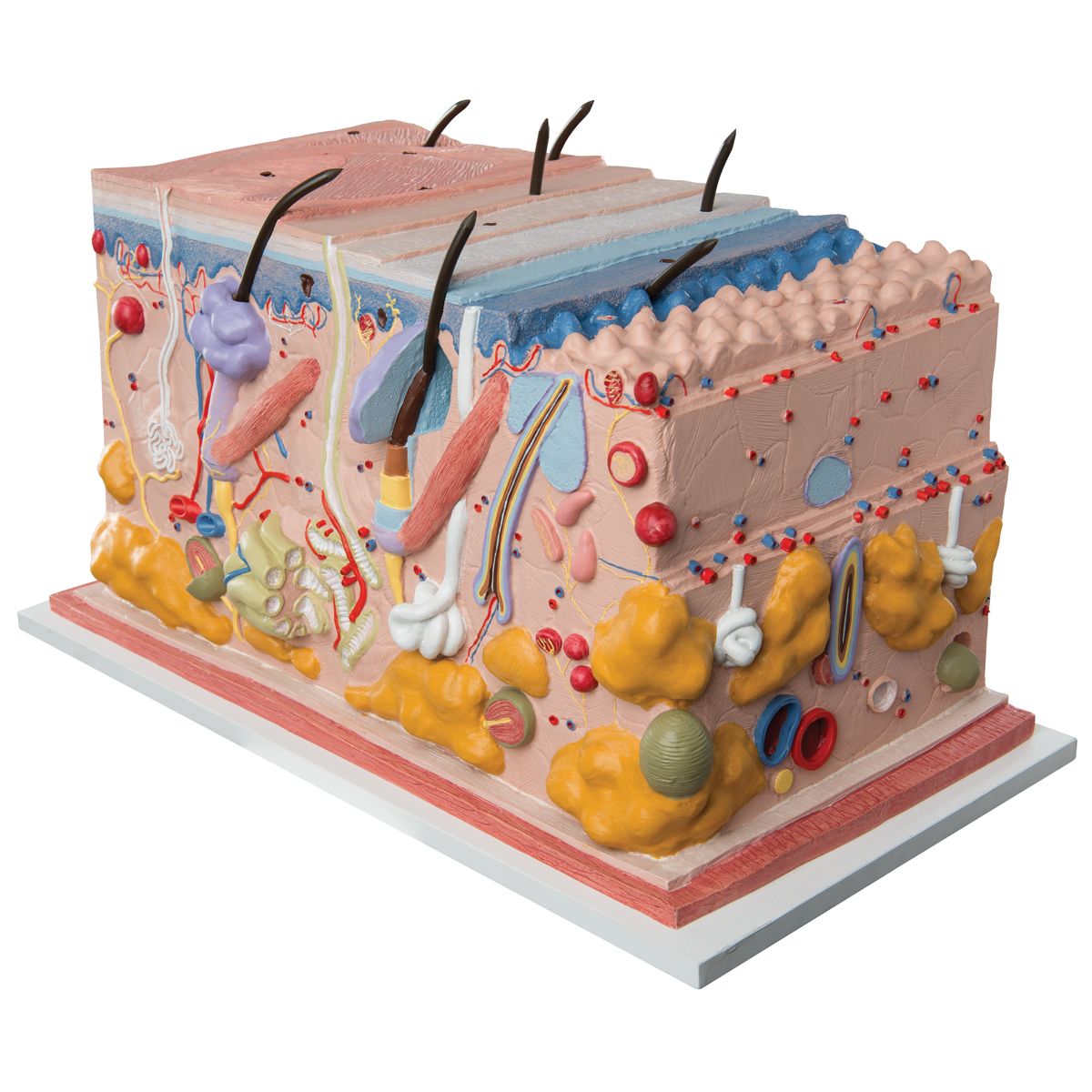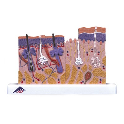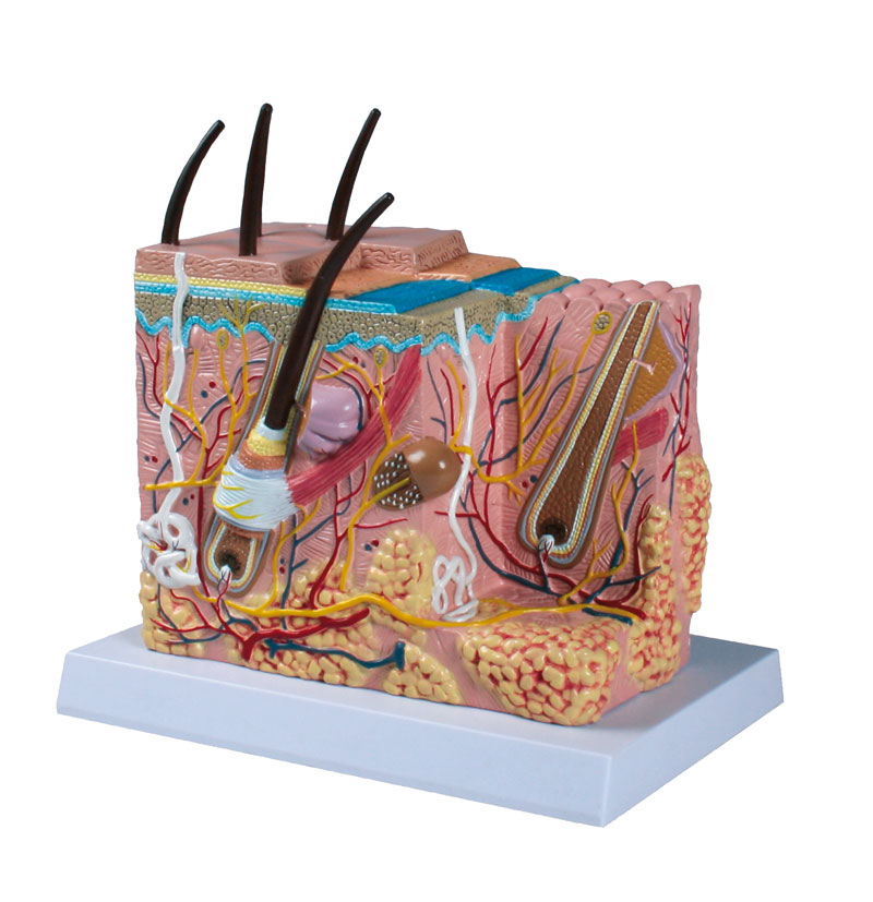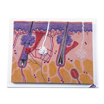 Dieses Modell einer menschlichen Haut in etwa 50-facher Vergrößerung zeigt dreidimensional die verschiedenen Hautschichten und anatomischen Strukturen. Neben Nerven und Blutgefäßen sind im Modell Schweißdrüsen, Talgdrüsen, Haarfollikel, Haarmuskeln, Vater-Pacinische Lamellenkörperchen und vieles mehr dargestellt.