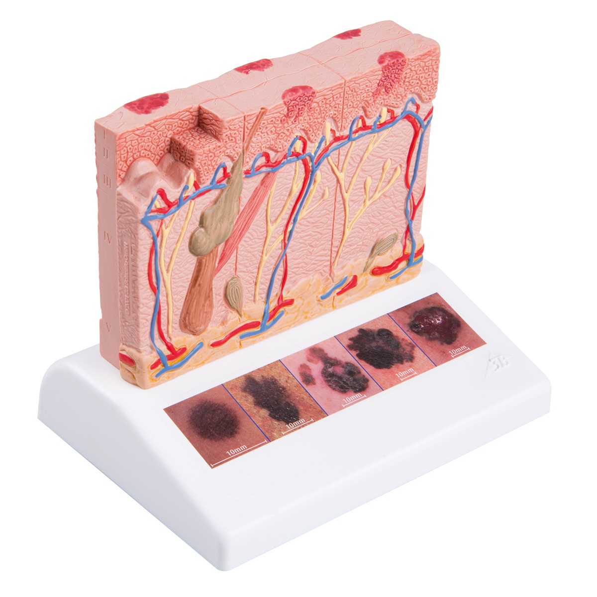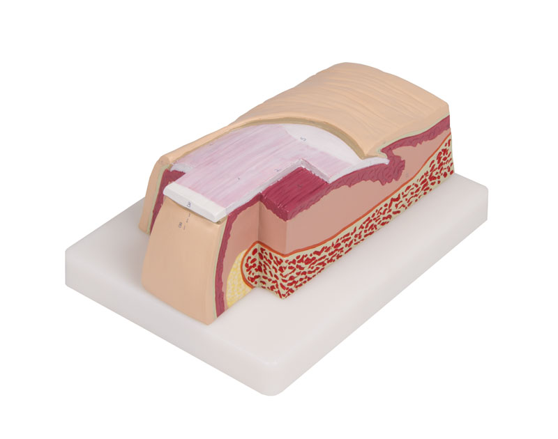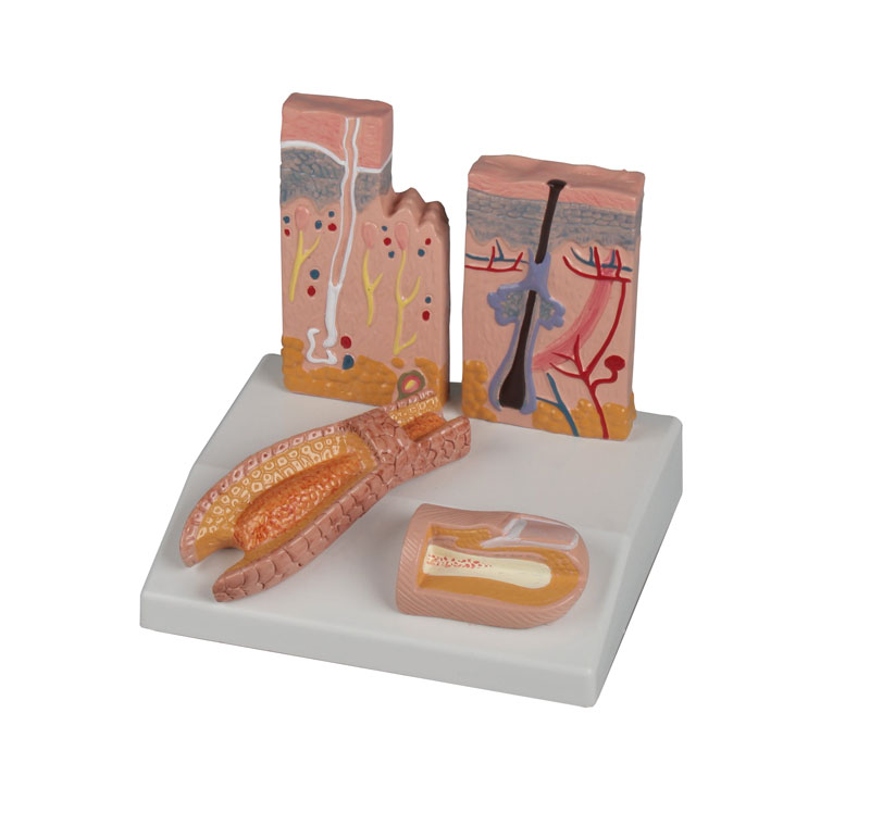 Das Modell besteht aus jeweils drei Einzelanteilen auf einem gemeinsamen Sockel, welche jeweils Anschnitte der menschlichen Haut in einer 80-fachen Vergrößerung repräsentieren. Anatomische Unterschiede der Hautanteile werden so didaktisch verständlich dargestellt.