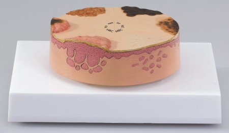 Dieses sehr anschauliche Modell zeigt sechs verschiedene Hautveränderungen. Es handelt sich zum Teil um normale Veränderungen, zum Teil um Krebserkrankungen.