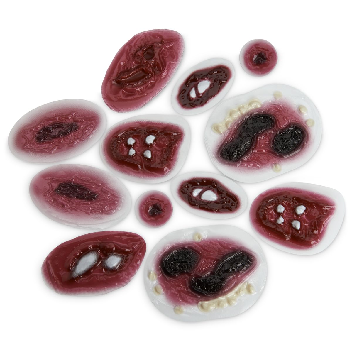 Dieses Set beinhaltet ein breites Spektrum blutender und nicht blutender Wunden. Die perfekte Ergänzung zu einer Übungspuppe.