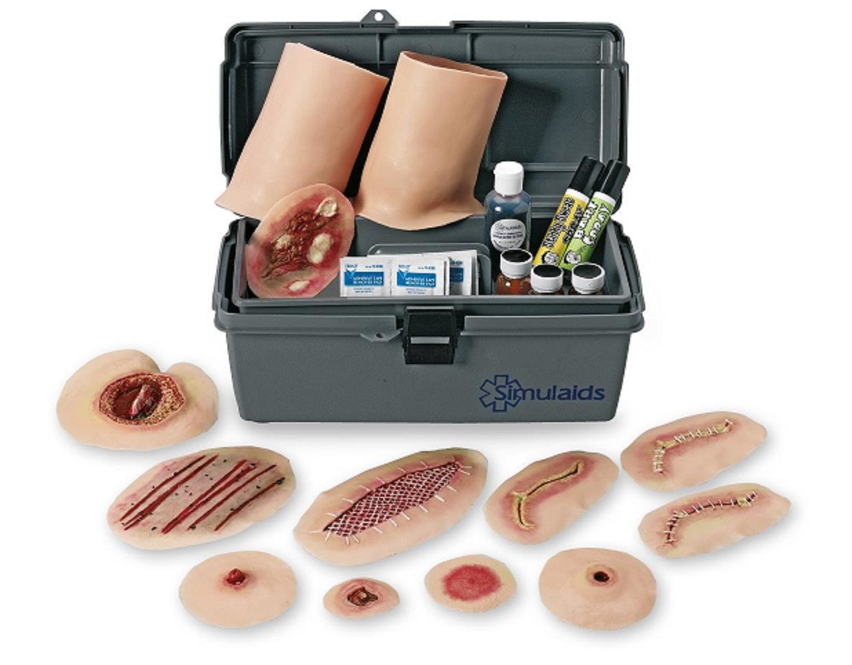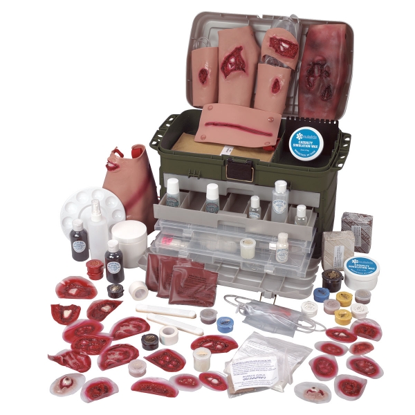 Die Simulation kann je nach Bedarf ganz einfach oder sehr fortgeschritten sein, indem auch weitere realistische Elemente einbezogen werden, z.B. Schweiß, Blut, Eiter, Schleim oder andere „Rezepturen“, die zur Schaffung einer realistischen Lernumgebung erforderlich sind. Das Pflege-Wunden-Simulations-Kit Ultra enthält alles was man benötigt, um komplexe Szenarien zu schaffen und die Lernenden so durch eine Vielzahl von sinnlichen Wahrnehmungserfahrungen zu unterstützen. Im Lieferumfang sind simulierte Wunden, Make-up und weiteres Zubehör enthalten. Das Kit wird in einem festen Koffer geliefert.