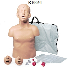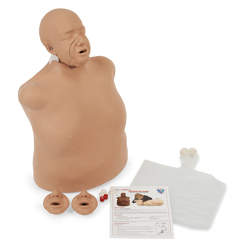 "Wiederbelebungstorso, übergewichtig" Diese preisgünstige HLW-Puppe ist aus weichem, lebensechtem PVC über Polyurethanschaum hergestellt und fühlt sich lebensecht an. Die Funktionen umfassen einen längeren Torso, um Heimlich-Handgriff und Kopfüberstreckung / Kinnhebung zum Freimachen der Atemwege realistisch üben zu können; sie kann leicht manipuliert werden, um eine Atemwegsobstruktion oder Erstickungssituationen realistisch simulieren zu können, und hat ein benutzerfreundliches Lungen-Luftwegsdesign, das eine Reinigung unnötig macht. Wird mit Knieschonern und Tragetasche, drei Gesichtsteilen und drei Einweg-Lungen-/Luftwegssystemen geliefert.